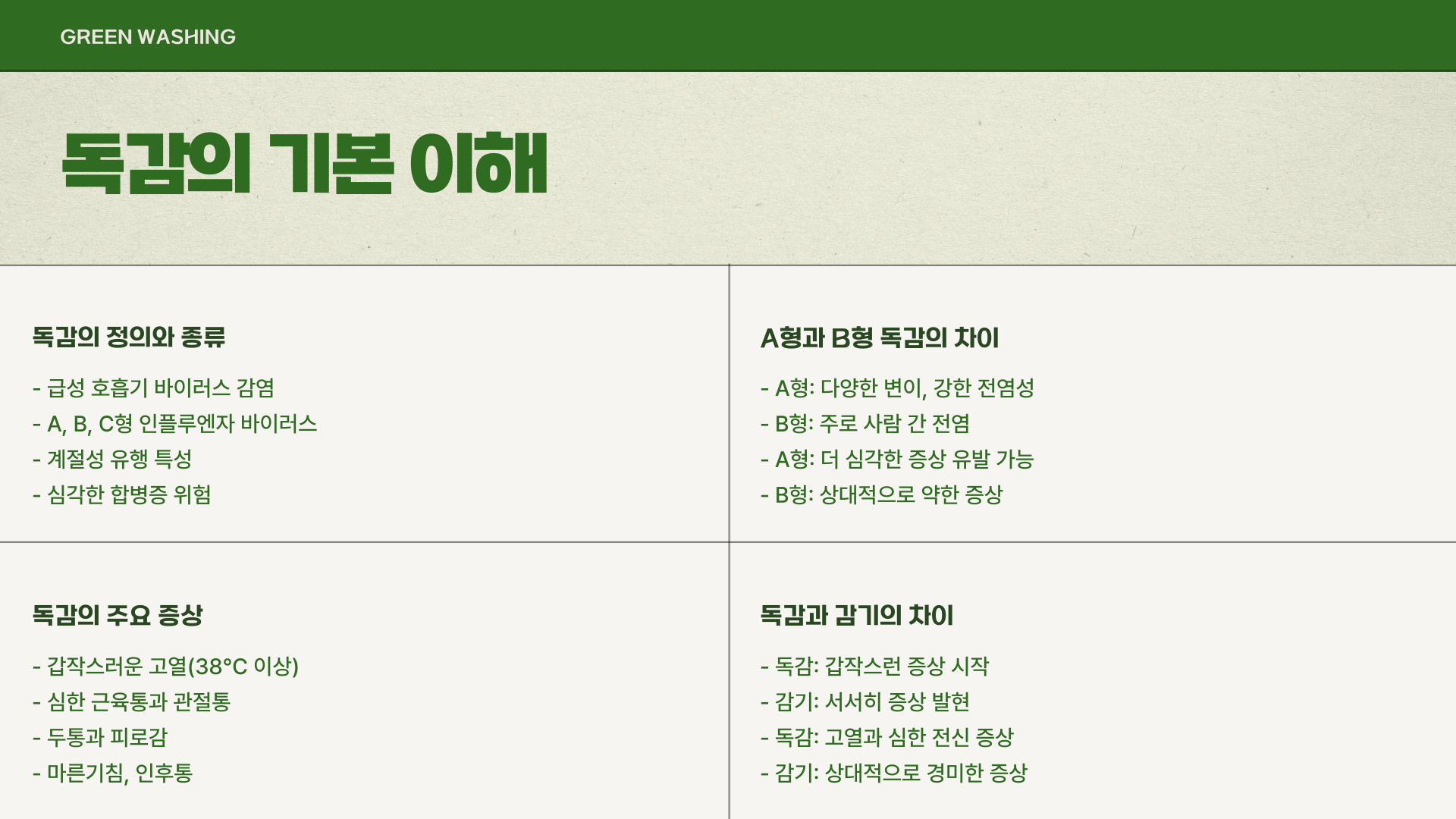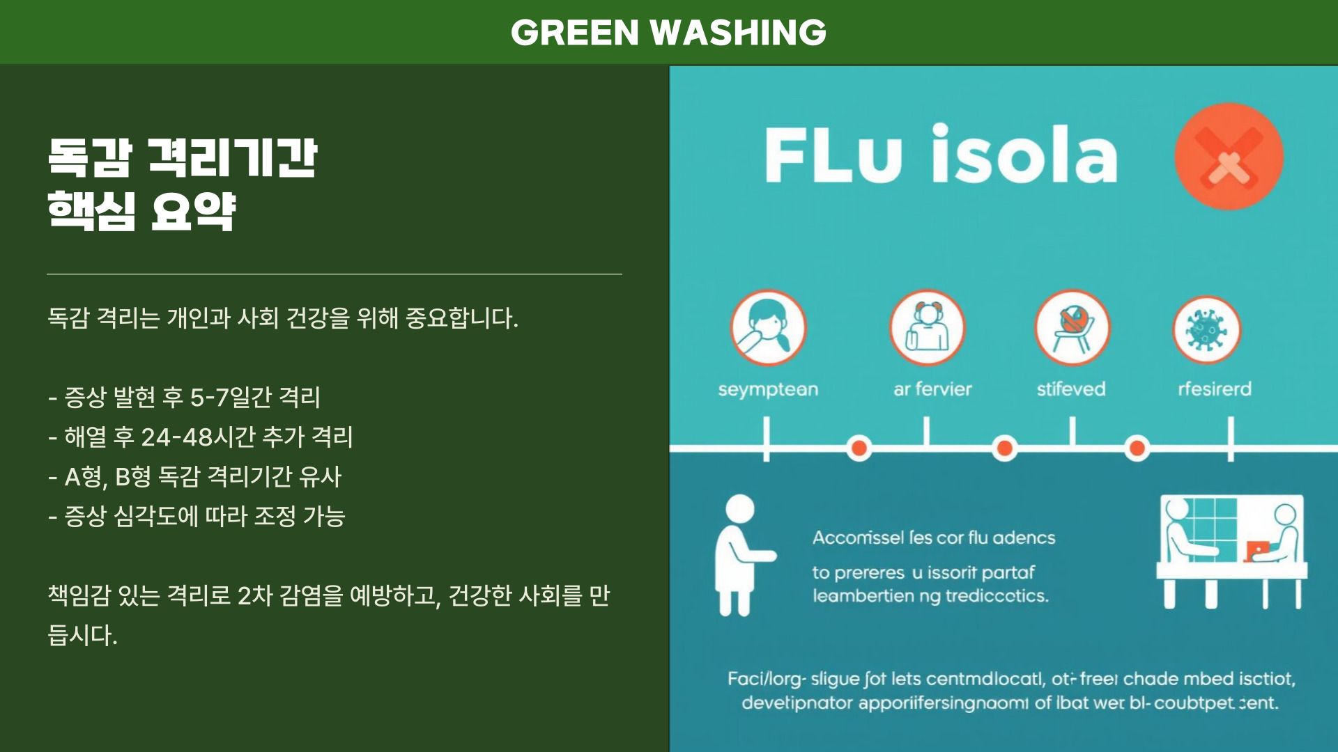 - 독감 증상 발생 시 즉시 격리 필요