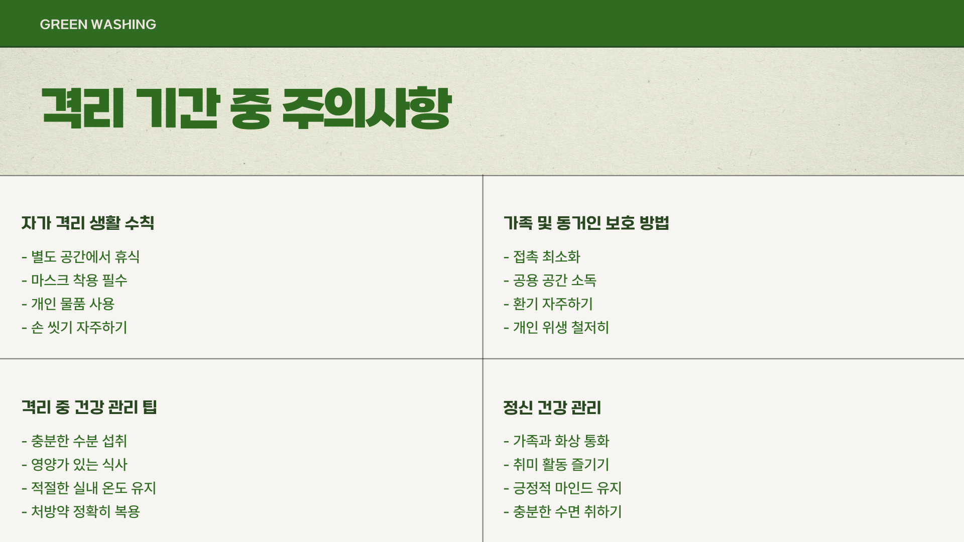 격리기간 동안에는 적절한 수분 섭취와 휴식이 필요합니다. 또한, 올바른 영양 섭취와 함께, 증상 완화를 위한 약물 복용이 권장됩니다. 이러한 조치를 통해 빠른 회복을 도모할 수 있으며, 자신뿐만 아니라 가족과 친구들에게도 스스로 안전할 수 있는 환경을 제공합니다. 중요한 것은 이러한 격리조치를 소홀히 하지 않아야 한다는 점입니다.