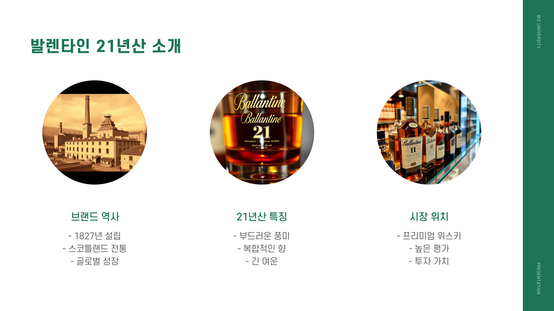 - 발렌타인 21년산은 깊은 맛과 향이 특징입니다.