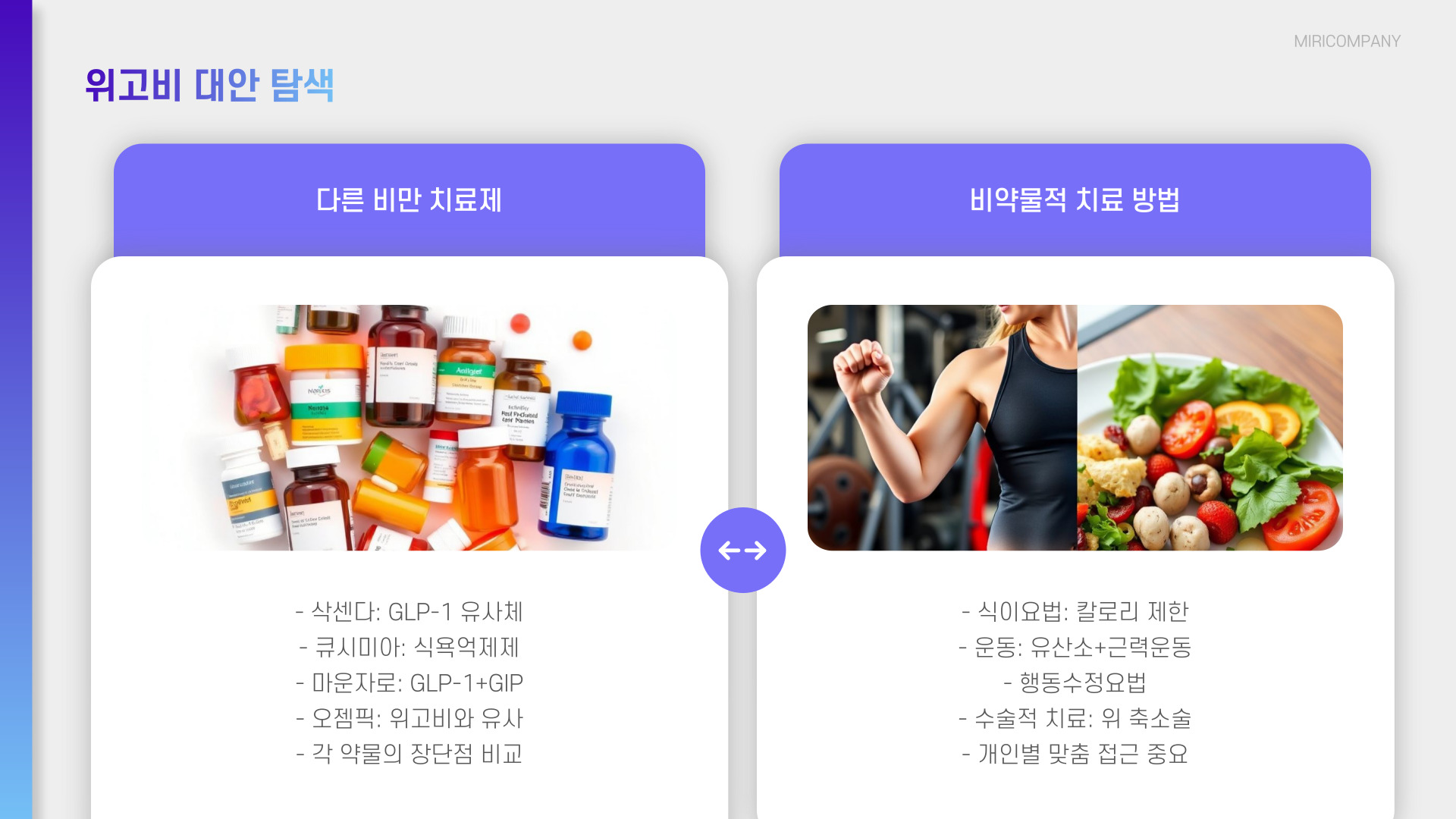 위고비와 같은 약물 사용이 가끔은 필요할 수 있지만, 대체할 수 있는 방법들도 고민해보세요. 운동이나 식이요법을 통해 체중을 조절할 수 있는 방법이 다양합니다. 적절한 식단 조절과 유산소 운동을 통해 자연스럽게 체중을 감량할 수 있습니다.