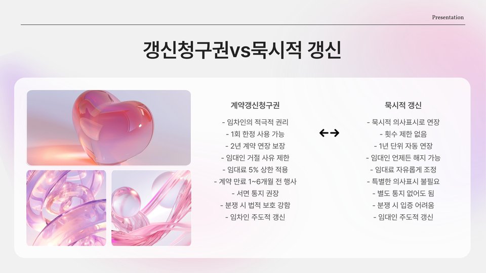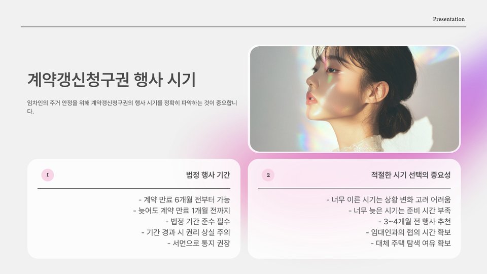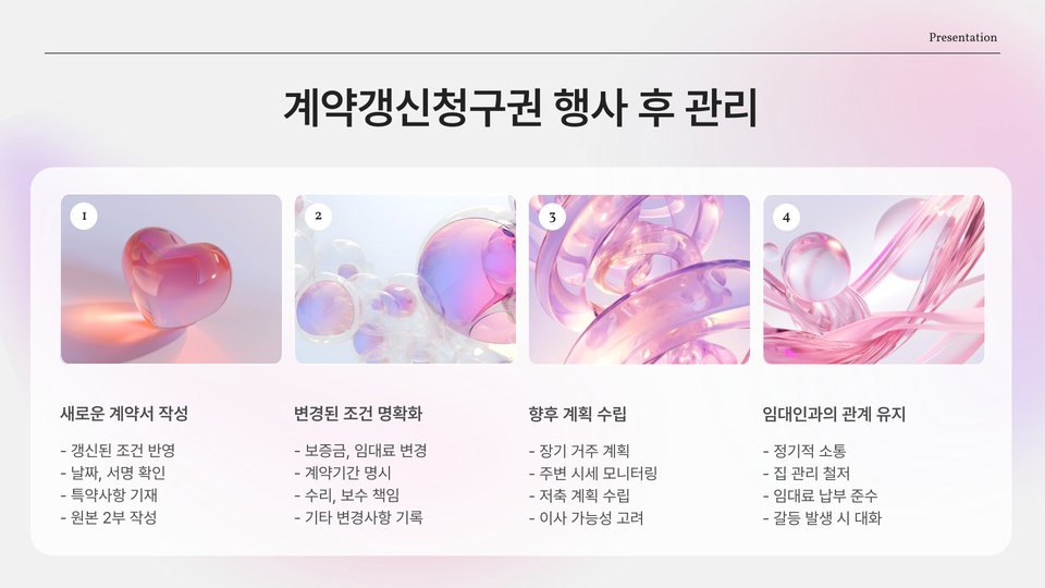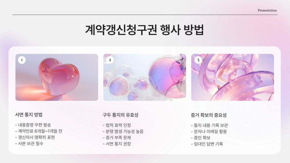 - 갱신 요청은 계약 만료 1개월 전까지 서면으로 통보해야 함.