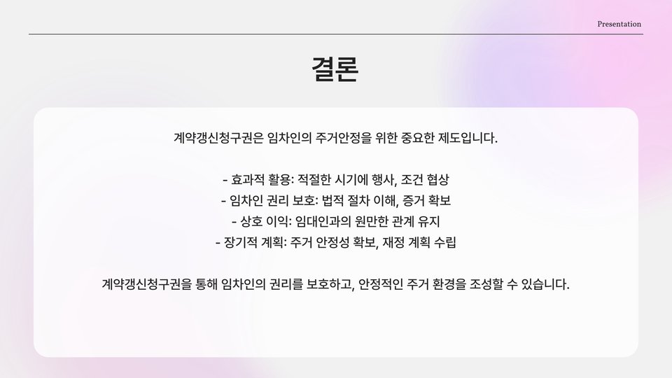 전세계약 갱신청구권은 임차인에게 중요한 권리이며, 이를 잘 이해하고 활용하는 것이 필요합니다. 법적 절차와 주의사항을 잘 숙지하여 안정적인 주거 생활을 영위할 수 있도록 해야 합니다. 최종적으로, 갱신청구권을 통해 임차인은 자신의 권리를 지키고, 안정적인 거주 환경을 마련할 수 있습니다.