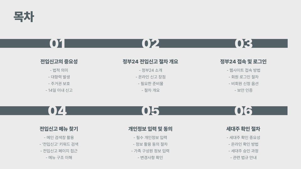 | 절차 | 정부24 접속 → 전입신고 메뉴 선택 → 정보 입력 → 확인 |