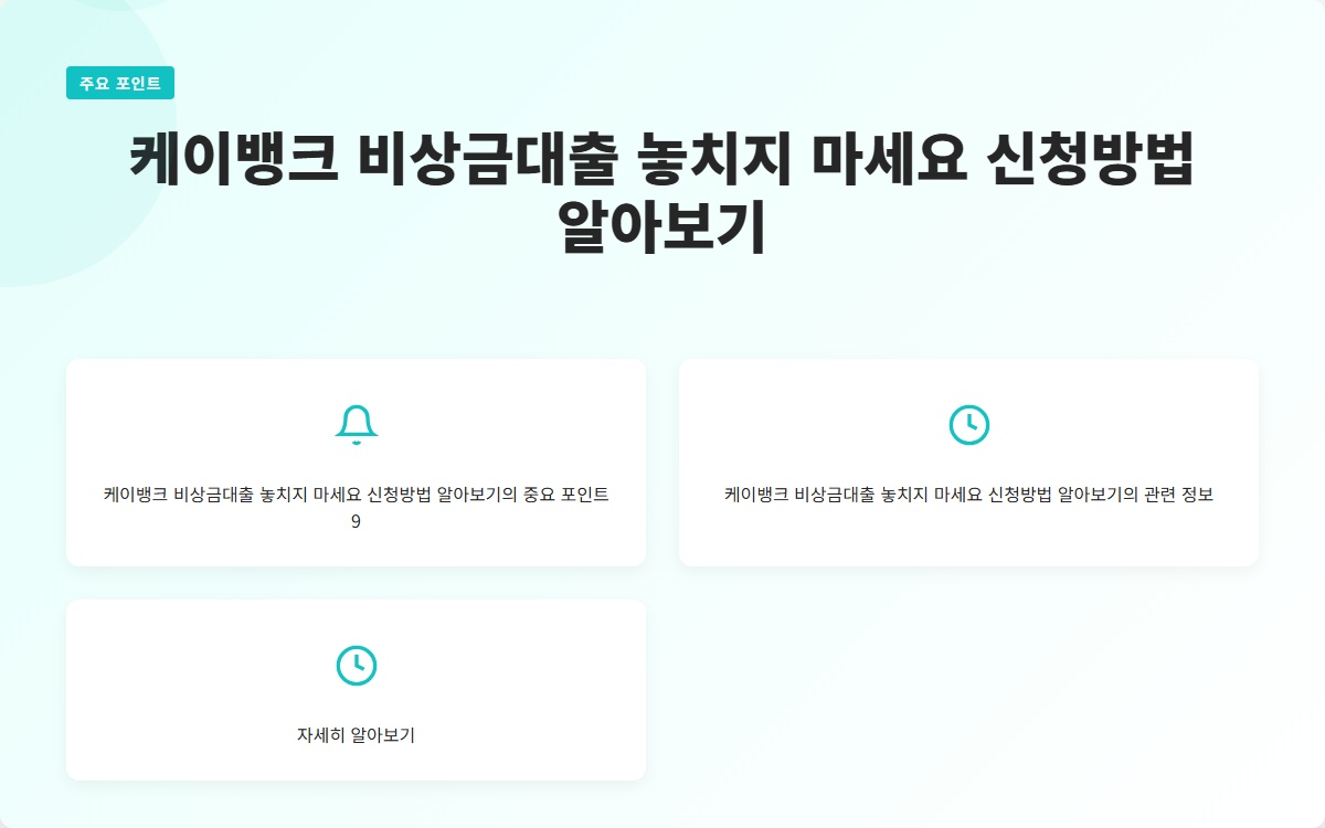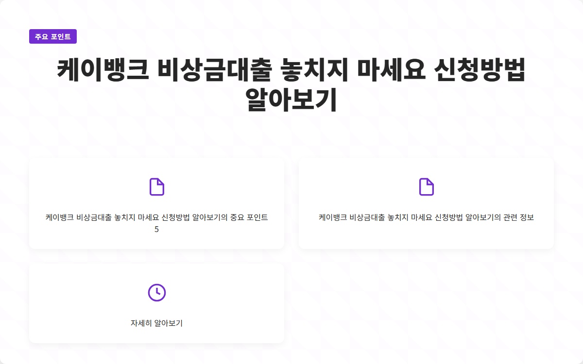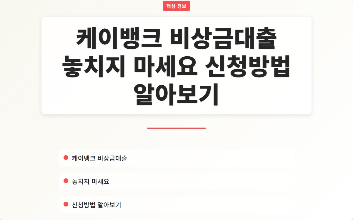 이 정보들이 여러분의 현명한 재정 결정에 도움이 되길 바랍니다. 케이뱅크 비상금대출을 통해 안정적인 금융 상황을 유지하세요!