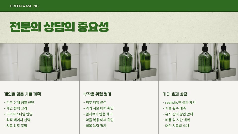 - 전문가와 상담하여 개인 피부 상태에 맞는 치료 계획 수립이 필요합니다.